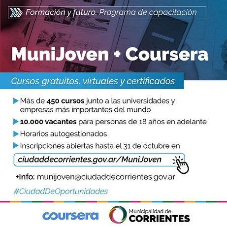 Información General | Mediante la plataforma de educación virtual Coursera, se podrán realizar múltiples cursos gratuitos con entregas de certificado. Las inscripciones están abiertas hasta el 31 de octubre y se encuentra disponible en https://ciudaddecorrientes.gov.ar/munijoven. “Tenemos 10 mil cupos a disposición”, afirmó el secretario de Coordinación de Gobierno, Hugo Calvano.