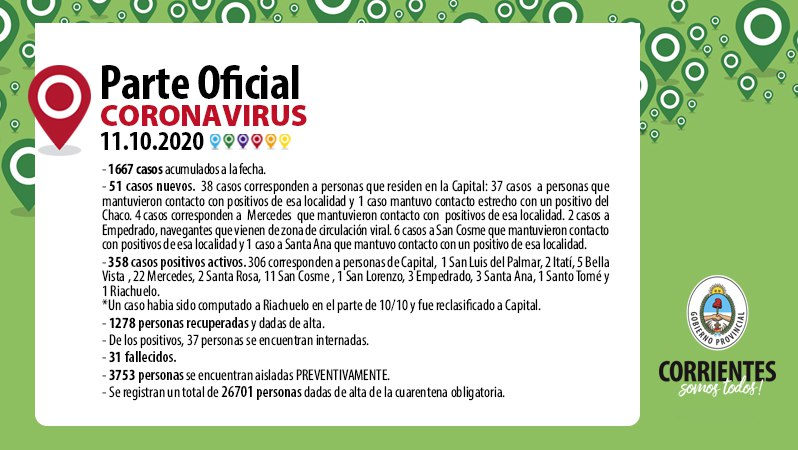 Información General | El informe epidemiológico de la Provincia da cuenta que hubo 32 casos nuevos de Coronavirus, de los cuales 26 son de Capital, 4 de Mercedes 1 de Santo Tomé 1 de Santa Ana, se acumulan a la fecha 1566 contagios de los cuales se han recuperado 1198 personas que fueron dadas de alta. Se encuentran activos 337 positivos de los cuales 32 se encuentran internados en condición clínica estable.