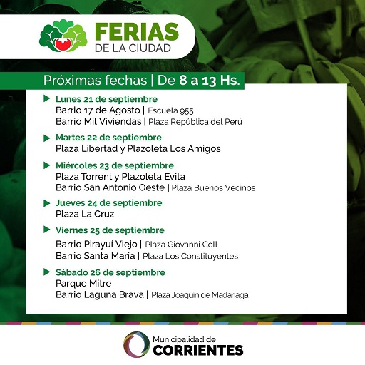 Información General | Los feriantes estarán durante la próxima semana en el 17 de Agosto, Mil Viviendas, San Antonio Oeste, Pirayuí Viejo, Santa María y Laguna Brava, además de las plazas Libertad, Torrent y La Cruz, como así también en las plazoletas Los Amigos y Evita. Entre tanto el sábado se apostarán en el parque Mitre.