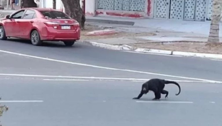 Información General | Durante el fin de semana transeúntes y vecinos del barrio La Rosada encontraron a un ejemplar de mono carayá de gran tamaño deambulando por las inmediaciones de la avenida Poncho Verde. El animal, que andaba suelto y se desconoce si poseía propietario, se dirigió hacia la plazoleta Los Amigos y se refugió en un árbol, según relataron algunos de los peatones que lograron fotografiar al simio.