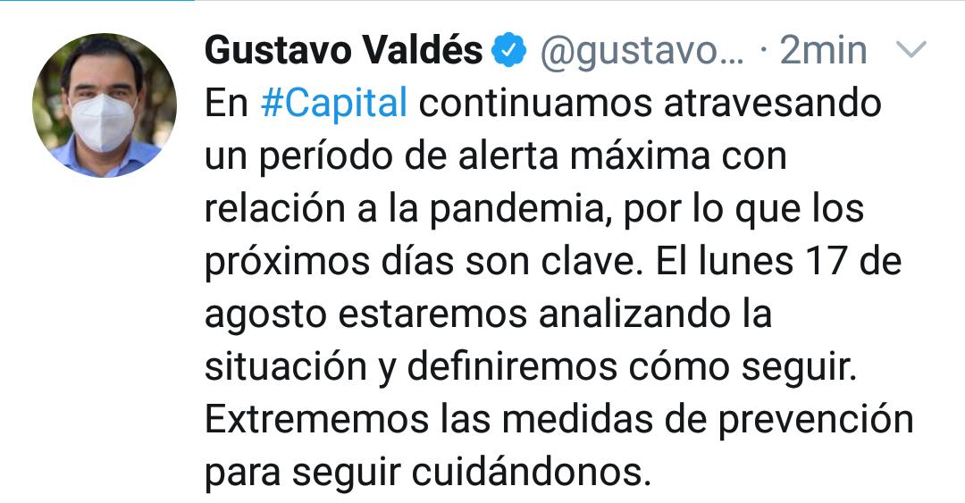 Información General | Esta mañana el gobernador de la Provincia, Gustavo Valdés, sobre la situación epidemiológica de la ciudad de Corrientes, publicó en su cuenta de Twitter oficial @gustavovaldesok que “en Capital continuamos atravesando un periodo de alerta máxima con relación a la pandemia, por lo que en los próximos días son claves”.