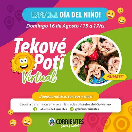 Información General | Este domingo 16 se emitirá una edición especial del Tekové Potí Virtual por el Día del Niño. Será a partir de las 15 por las redes oficiales del Gobierno de Corrientes. Actuarán artistas como Juliana Gallipoliti, el Mago Gabriel y los ganadores del Teko Talentos. Además habrá juegos, sorteos y otras sorpresas.