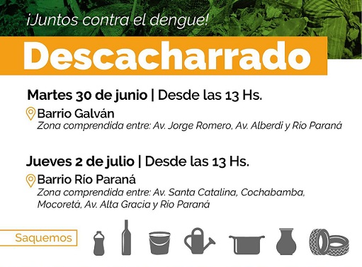 Información General | La intervención municipal se realizará desde las 13 en el sector comprendido por las avenidas Jorge Romero, Alberdi y el río Paraná. Hasta dicha hora los vecinos podrán depositar en las esquinas todos aquellos los elementos que puedan contener agua, y así evitar la proliferación de los mosquitos que transmiten el dengue.