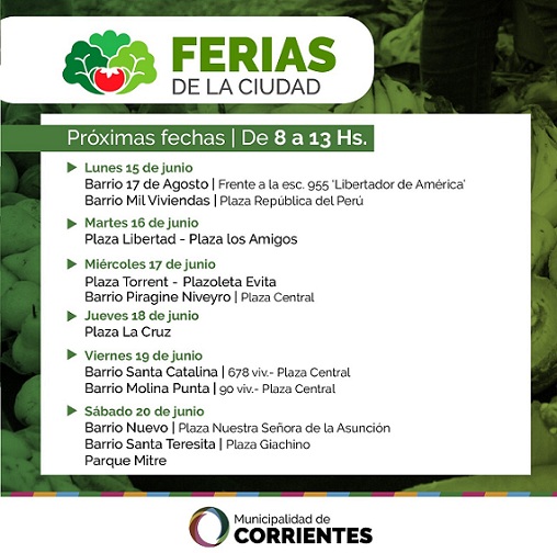 Información General | En simultáneo, por diferentes zonas de la ciudad, la próxima semana las Ferias de la Ciudad acercarán a los vecinos alimentos saludables y a precios accesibles. Los barrios Molina Punta, Piragine Niveyro, Nuevo, Mil Viviendas y Santa Catalina son algunos de los lugares donde estarán los feriantes ofreciendo sus productos, bajo las normas de seguridad sanitaria correspondientes ante la pandemia de Covid-19.