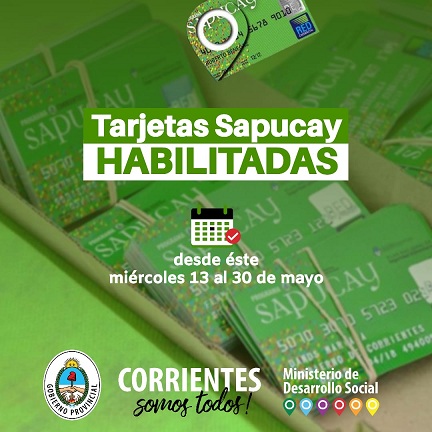 Información General | El Ministerio de Desarrollo Social de Corrientes, a cargo de Adán Gaya, informó que las Tarjetas Sapucay están habilitadas desde ayer 13 y hasta el 30 de mayo próximo.