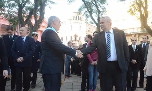Política | El mandatario encabezó los festejos por los 199 años de Independencia. Hubo desfile y chocolatada. Tuvo que cruzarse con el intendente Ríos, con un saludo frío y algunas palabras. Nada se dijo del resultado de las elecciones.