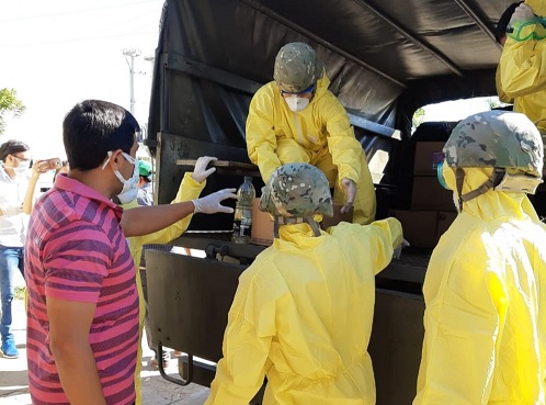 Información General | Con la colaboración de efectivos y camiones del Ejército Argentino comenzó a llegar la asistencia a las más de 1200 familias del barrio San Marcos que fueron puestos en cuarentena por decisión de las autoridades sanitarias luego de que se detectarán tres casos de COVID 19 en sus vecinos. Módulos alimentarios, elementos de higiene y garrafa social fueron los principales elementos distribuidos casa por casa por personal de Desarrollo Social.