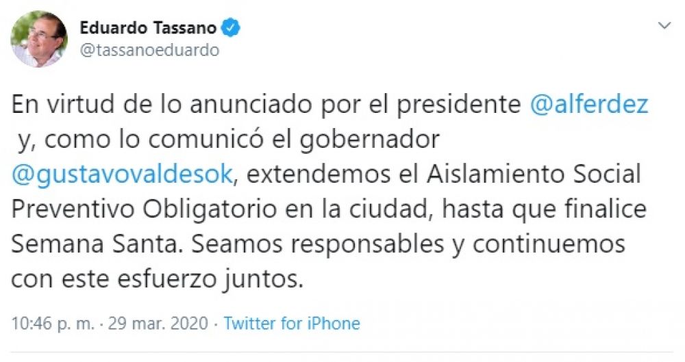 Información General | Luego de que el presidente de la nación anunciara la decisión de extender la cuarentena en el país para evitar la proliferación de los casos de COVID-19, el intendente de la ciudad de Corrientes, Eduardo Tassano confirmó vía Twitter, en la misma línea que el gobernador Gustavo Valdés, que hasta el final de Semana Santa Corrientes permanecerá bajo la cuarentena total.