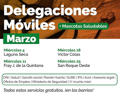 Información General | El 4 de marzo volverá el programa de Delegaciones Móviles, con Mascotas Saludables en el barrio Laguna Seca por Las Piedras, entre Palermo y Cartagena. El operativo, que incluye prestaciones sanitarias y servicios gratuitos de organismos comunales y provinciales, se hará todos los miércoles, de 8 a 12. También habrá colocación de vacunas antirrábicas, castraciones y desparasitaciones a animales domésticos.
