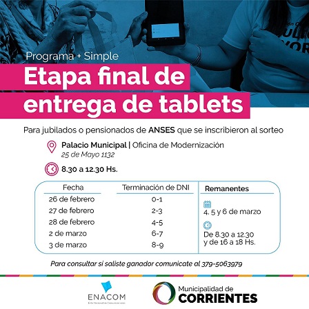 Información General | En la Subsecretaría de Modernización se harán entrega a partir del miércoles 26 de los dispositivos electrónicos remanentes a aquellos jubilados de la Anses, mayores de 60 años, que resultaron favorecidos en los sorteados realizados. Se trata del convenio firmado en 2019 por la comuna capitalina y el Ente Nacional de Comunicaciones (ENACOM), en el marco del programa Más Simple.