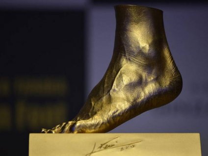 Deportes | La réplica en oro puro llamada Golden Foot pesa 25 kilos y vale cuatro millones de euros. Fue presentada en una famosa joyería de Tokio. Parte de lo recaudado será destinado a los damnificados por el terremoto y Tsunami ocurrido en Japón en 2011. También se presentaron otras piezas del rosarino.