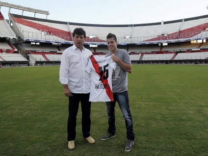 Deportes | El flamante refuerzo millonario cumplió con su presentación formal en el equipo y bromeó: "Ramón sabrá donde ponerme. Si me lo pide, juego en el arco y todo". Además, Passarella lo llevó a conocer el club.