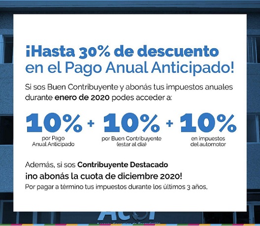Información General | El beneficio rige para todos los tributos e impuestos, y comprende a quiénes estén “al día” en el pago de sus contribuciones al 31 de diciembre de 2019. Las bonificaciones incluyen un 10% por buen contribuyente, otro 10% por pago anual anticipado, y un extra del 10% para el impuesto automotor. Además, el “vecino destacado”, no pagará la cuota del mes de diciembre.