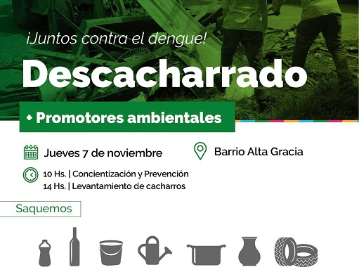 Información General | Se trata de un trabajo que viene llevando adelante la Secretaría de Desarrollo Humano, Ambiente y Desarrollo Sustentable. En ese marco un equipo de agentes municipales recorrerán el barrio Alta Gracia para invitar y concientizar a los vecinos sobre la importancia de evitar la proliferación del mosquito transmisor y de sumarse al operativo de descacharrado y de concientización.