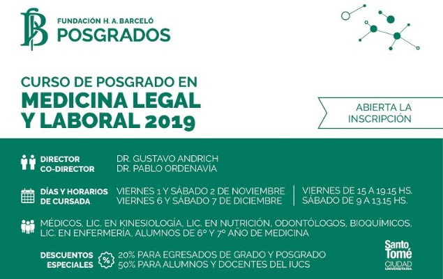 Información General | Fundación Barceló anuncia la apertura de las inscripciones para cursar en Sede Santo Tomé, el Posgrado en Medicina Legal y Laboral. Con modalidad presencial que inicia el cursado el viernes 1º de noviembre y tendrá 4 encuentros (dos viernes y dos sábados).