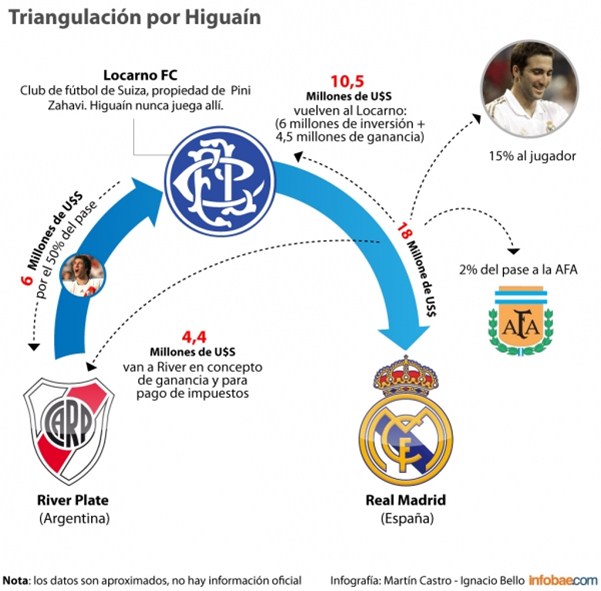 Deportes | El pase de Gonzalo Higuaín de River al Real Madrid, a través del Locarno de Suiza, es uno de los casos emblemáticos y más escandalosos de las operaciones en las que se utilizan clubes extranjeros a través de los cuales se tributa menos dinero
