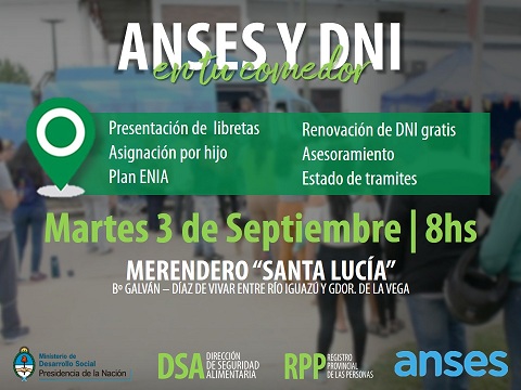 Información General | Este martes 3 de Septiembre a partir de las 8 horas el programa "ANSES Y DNI EN TU COMEDOR" estará en el Merendero “Santa Lucia” ubicado en Díaz de Vivar entre Río Iguazú y Gobernador de la Vega. Este operativo es una acción conjunta de Provincia y Nación.