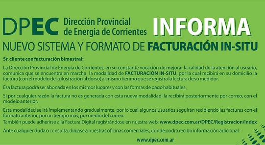 Información General | La Dirección Provincial de Energía de Corrientes (DPEC) pondrá en marcha este 2 de septiembre la modalidad de FACTURACIÓN IN-SITU, por la cual casi cinco mil usuarios de la Capital recibirán en su domicilio la factura, en el mismo momento que se registra la lectura de su medidor.