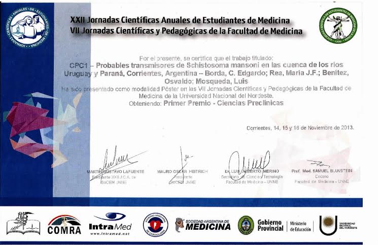 Política | Los investigadores Edgardo Borda, María Josefa Rea, Osvaldo Benítez y Luis Mosqueda presentaron en modalidad poster el estudio realizado en arroyos, bañados, esteros, cañadas y represas de cinco departamentos: Mercedes, Paso de los Libres, Curuzú Cuatiá, General San Martín y Santo Tomé.