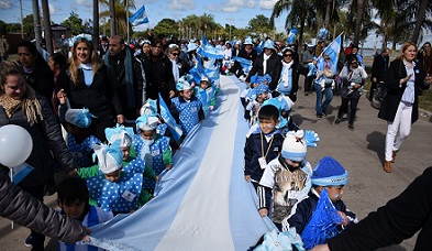 Información General | Los pequeños que asisten a los 15 CDI Mitaí Roga recorrieron la avenida Juan Pablo II junto con sus familias, luciendo indumentaria celeste y blanca y portando una bandera de 150 metros. Así, ratificaron los conceptos de soberanía e identidad nacional en adhesión al Día de la Independencia. Luego, se realizó un acto en el Paseo Arazaty, que fue encabezado por el viceintendente Emilio Lanari.