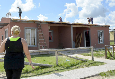 Los hogares, construidos por la organización social Tupac Amarú, fueron averiados por el fuerte vientos del viernes último. Dos casas perdieron chapas y tirantes, otras dos viviendas tuvieron fisuras y rajaduras en sus cargas. Este lunes 22 de febrero los cooperativistas comenzaron a colocar las nuevas chapas, tirantes y reconstruyen las cargas de los techos.