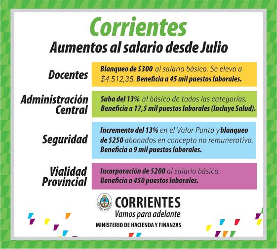 El ministro Vaz Torres informó que, por instrucción del gobernador Ricardo Colombi y articulación con el Banco de Corrientes S.A., el pago de los haberes de julio con el segundo tramo de la recomposición salarial, se liquidará en tres días, entre el 26 y 28 de este mes. En tanto que adelantó que el plus-adicional de $900 se abonará entre el 12 y 14 próximo.