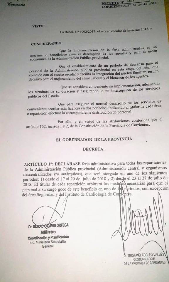 El Gobernador de la provincia, Gustavo Valdés dio a conocer a media mañana del lunes, el decreto por el cual anuncia las fechas de la Feria Administrativa para todas las reparticiones de la Administración Pública correntina. Las fechas serán del 17 al 20 y del 23 al 27 de julio coincidiendo con el receso escolar invierno 2018 y se aclara que los agentes gozarán de una semana de las dos decretadas por el primer mandatario correntino.