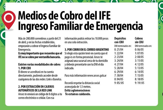 Más de 200 mil correntinos, percibirán desde el martes 21 del corriente, el beneficio del Ingreso Familiar de Emergencia de 10 mil pesos, otorgado por el Gobierno Nacional a través del ANSES, para paliar la crisis que genera la pandemia del Coronavirus en las economías familiar.