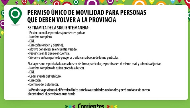 Para ello deberán enviar un correo electrónico a la dirección de permisos@corrientes.gob.ar, que contenga nombre completo del solicitante, además del número de DNI, dirección –origen y destino-, motivo por el cual se encuentra varado, provincia en la que se encuentra y por último, aclarar si su regreso lo realizará mediante transporte de pasajeros o de forma particular.