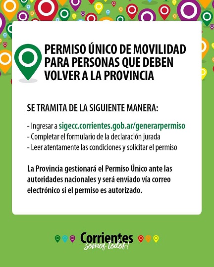 El gobierno Provincial sumándose a las medidas de repatriación de los argentinos varados, impulsada por parte del gobierno nacional, resolvió habilitar una nueva manera de tramitar el permiso único de movilidad para personas que requieran volver a Corrientes o al interior provincial. La disposición rige para movilizarse tanto en colectivo de pasajeros como en automóvil particular.