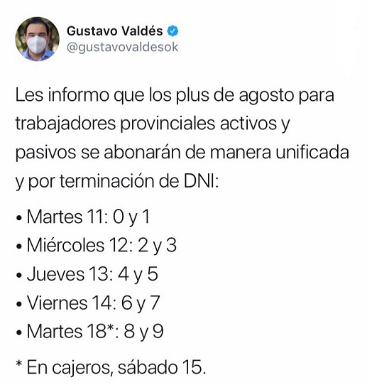 A través de su cuenta de twitter @gustavovaldesok, el gobernador Gustavo Valdés confirmó y dio detalles del cronograma de liquidación del adicional de $11.500 correspondiente a este mes. La Provincia comienza abonar este martes 11 a los agentes de la administración pública correntina, tanto a activos, jubilados y pensionados.
