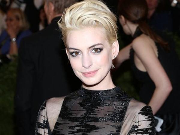 "Es temporal", aclaró cuando le preguntaron por el cambio. Hathaway acompañó su peinado con un vestido largo negro con brillos, transparencias y considerable escote lateral, sin miedo a cometer un desastre de vestuario como el que dio tanto que hablar en los Oscar.