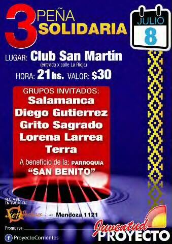 Peña Solidaria organizada por la Juventud de Proyecto Corrientes a beneficio de la parroquia San Benito, 8 de julio, 21 hs, Club San Martin valor de la entrada de $30...los esperamos para compartir una hermosa noche en familia y amigos!!!!!