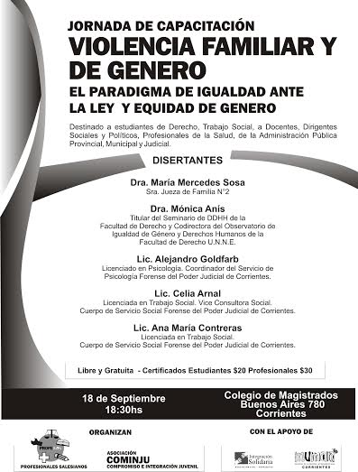 Este miércoles 18 de septiembre, a partir de las 18,30 horas, se desarrollará en el Colegio de Magistrados (Buenos Aires 780- Corrientes) una Jornada de Capacitación en Violencia Familiar y de Género, bajo la consigna: “El paradigma de igualdad ante la Ley y equidad de género”.