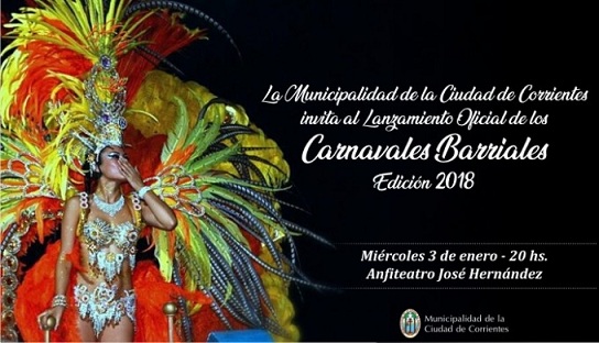 Información General | Este miércoles 3 de enero en el Anfiteatro José Hernández de la ciudad de Corrientes, se lanzarán oficialmente los Carnavales Barriales 2018, los cuales iniciará el 23 de enero a las 20 horas en el Bañado Norte y finalizará el 8 de febrero, con un gran cierre en la Costanera. Durante la misma se contará con la presencia del gobernador de la Provincia, Gustavo Valdés; el intendente de la Capital, Eduardo Tassano; el ministro de Turismo, Cristian Piris; y demás funcionarios.