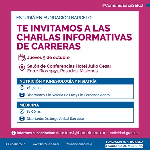 Información General | La Facultad de Medicina de la Fundación Barceló invita a la comunidad a participar de las Charlas abiertas y gratuitas sobre la Carreras de Grados de Medicina, Nutrición y Kinesiología. Este encuentro se realizará el día jueves 5 de octubre en el Salón de los Espejos del Hotel Julio Cesar, ubicado en Entre Ríos 1951, en Posadas Misiones.