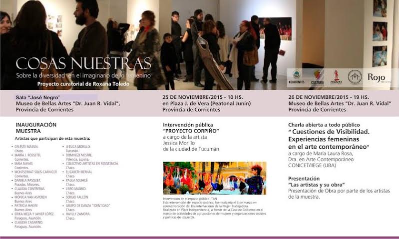 Información General | En el marco de la muestra “Cosas Nuestras. Sobre la diversidad en el imaginario de lo femenino”, actualmente en exhibición en la Sala “José Negro” del Museo de Bellas Artes de la ciudad de Corrientes, están previstas 2 actividades: la primera de ellas el próximo miércoles 25 de noviembre a las 10 en la plaza Juan de Vera de esta Capital, lugar en el cual la artista visual tucumana Jéssica Morillo presentará su intervención pública “Proyecto corpiño”.
