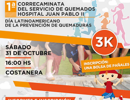 Información General | En el marco del Día Latinoamericano de la Prevención de Quemaduras que se conmemora el 31 de octubre, el Servicio de Quemados del Hospital Pediátrico Juan Pablo II organiza una Correcaminata. Será el próximo sábado, se recorrerán tres kilómetros partiendo a las 16 desde Lavalle y Costanera.