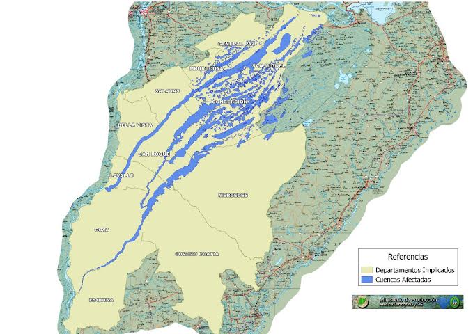 Información General | A raíz del seguimiento y verificaciones realizadas por técnicos del Ministerio de Producción y discutidos los daños en la reunión de la Comisión Provincial de Emergencia Agropecuaria, se determinó que las zonas más perjudicadas, declaradas en emergencia a causa de las excesivas precipitaciones ocurridas entre el 20 de Diciembre 2014 y 20 de Enero 2015, son las comprendidas en las cuencas de los Ríos Corriente (incluido Batel e Iberá) y Santa Lucía, como consecuencia del desborde de estos cuerpos de agua, que aumentaron en más de 40 veces la superficie comprometida por sus cauces.