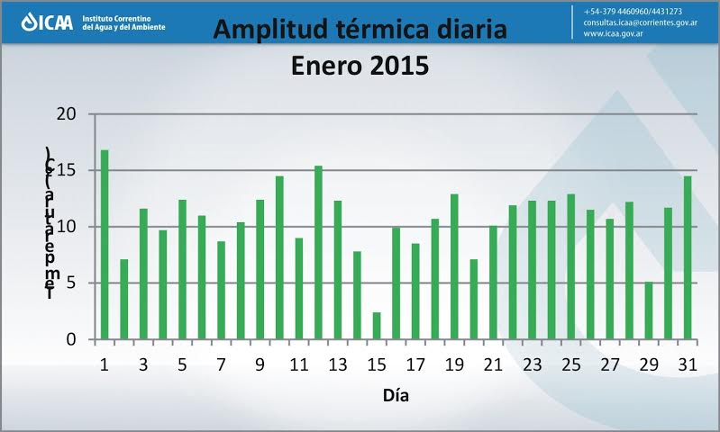 Información General | Durante el mes de enero de 2015 los días de temperaturas superiores a 35 grados fueron 14, según registro de la Estación Meteorológica del Instituto Correntino del Agua y del Ambiente (ICAA), instalada en la sede del mismo (Bolívar Nº 2275 del Barrio Libertad), en el centro de la ciudad de Corrientes.
