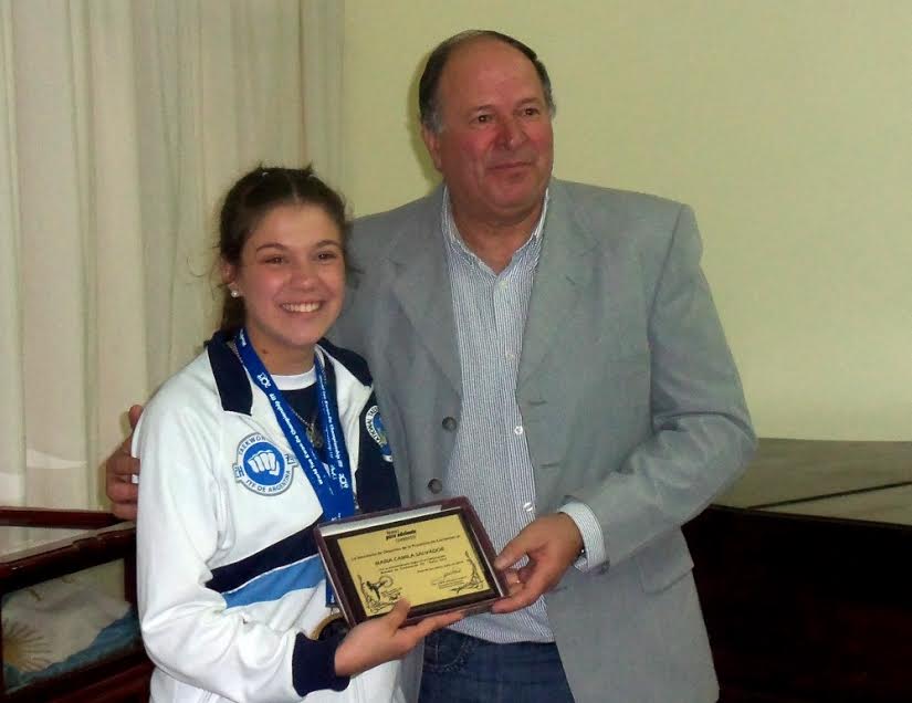 Información General | El Secretario de Deportes de la Provincia, Profesor Jorge Lucietti, entregó una placa de reconocimiento a Camila Salvador, la joven deportista que recientemente obtuvo una medalla de oro en el Mundial de Taekwondo ITF que se realizó en Roma, Italia.