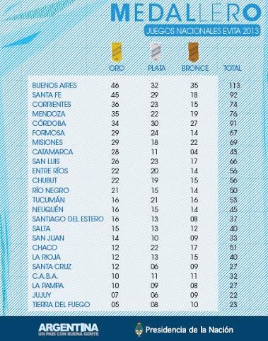 Información General | La delegación que representó a la provincia de Corrientes en los “Juegos Evita 2013” se ubicó en la tercera posición en el certamen deportivo y cultural que reúne año a año a miles de participantes de todo el país. Como se informó, este año los atletas correntinos cosecharon 36 medallas de oro, 23 de plata y 15 de bronce (74 en total).