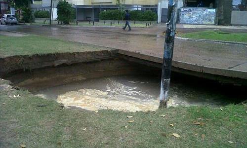 Información General | Se registró un hundimiento en el asfalto, en la esquina de Poncho Verde y Paraguay, como conscuencia de la abundante lluvia registrada hace unas horas, lo que hizo colapsar al arroyo Poncho Verde que atraviesa el lugar.