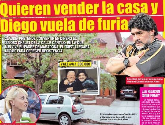 Información General | Según publica el Diario Crónica este martes, un nuevo conflicto amenazaría el seno de la familia del Diez. Al parecer, Claudia Villafañe quiere vender la casa de Villa Devoto -todo un símbolo para Diego- donde aún vive el padre del ex futbolista.