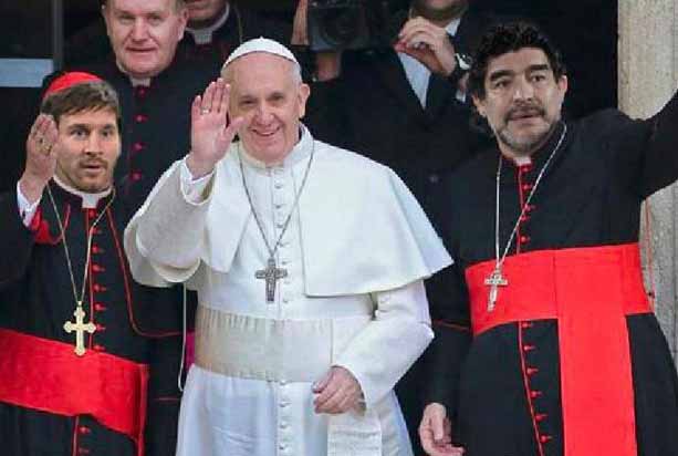 Información General | La elección de Jorge Bergoglio revolucionó las redes sociales. El mundo se hizo eco de la noticia. En Argentina, el hecho todavía causa asombro. En la web aparecieron varios de los típicos afiches futboleros para festejar de alguna manera la noticia. En la mayoría aparecen Diego Maradona y Lionel Messi, el Dios y el Messías de la pelota.
