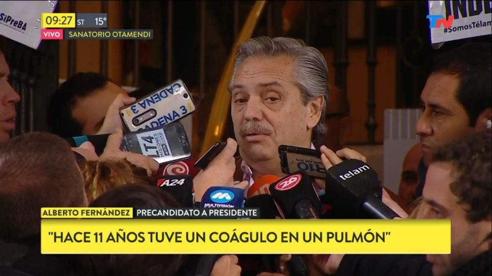 Nacionales | El candidato a presidente del kirchnerismo Alberto Fernández seguirá internado en el sanatorio Otamendi luego de que le detectaran una tromboembolia pulmonar y será dado de alta entre el miércoles y jueves. A pesar del cuadro, el ex jefe de Gabinete salió a decir que estaba “bien” y buscó desalentar las versiones que hablan de una patología pulmonar.