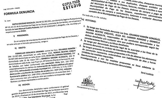 Política | Ramón Eduardo González esta acusado por asociación ilícita. La denuncia fue presentada por la actual jefa comunal Sintia Magaldi, de extracción justicialista, y su antecesor responde a Encuentro por Corrientes más Cambiemos. También involucran a familiares directos.