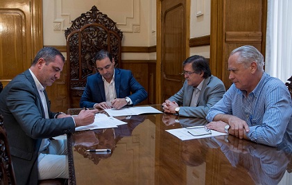 Política | El gobernador, Gustavo Valdés junto al ministro de Hacienda y Finanzas, Enrique Vaz Torres recibió en el Despacho de Casa de Gobierno al arquitecto director de la firma industrial Steinen SRL -con base en Alemania y Cataluña (Barcelona)- Javier Artero, para la firma del acta de compromiso que declara de interés provincial la inmediata ejecución de la planta Industrial de la empresa STEINEN en el departamento Capital de Corrientes.