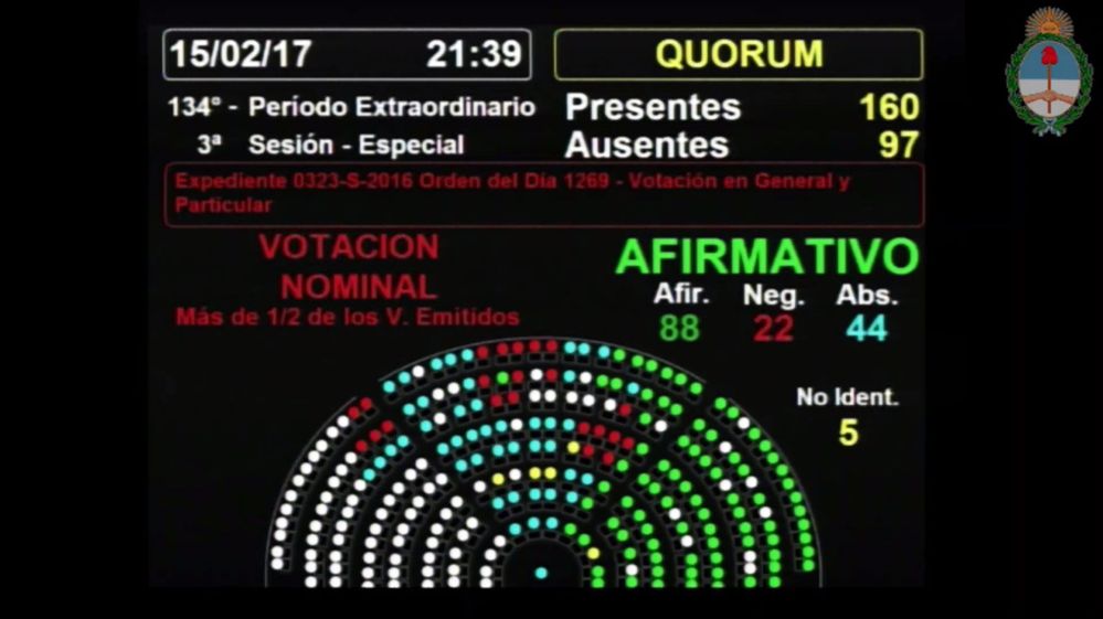Nacionales | El proyecto se convirtió en ley ya que tenía media sanción en el Senado. Luego de más de cinco horas en las cuales la oposición aprovechó para endilgarle al Gobierno el acuerdo con el Correo Argentino, propiedad de la familia Macri, y se presentaron 42 cuestiones de privilegio, la Cámara de Diputados aprobó la modificación a la ley de ART. Fue con 88 votos afirmativos, 22 negativos y 44 abstenciones. En un principio se esperaba que el oficialismo tuviera el apoyo de gran parte de la oposición -sobre todo el Frente Renovador y el bloque Justicialista- pero minutos antes de la votación estas dos bancadas anunciaron que se abstendrían porque se conoció que el Gobierno modificó la estimación de cálculo de la movilidad jubilatoria cada semestre.