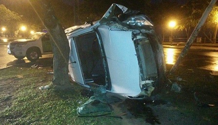 Policiales | Esta madrugada, luego de salir de un boliche ubicado en Costanera Sur, dos jóvenes que se trasladaban en un auto chocaron contra un poste en la curva de Costanera y Junín; el vehículo terminó volcado.